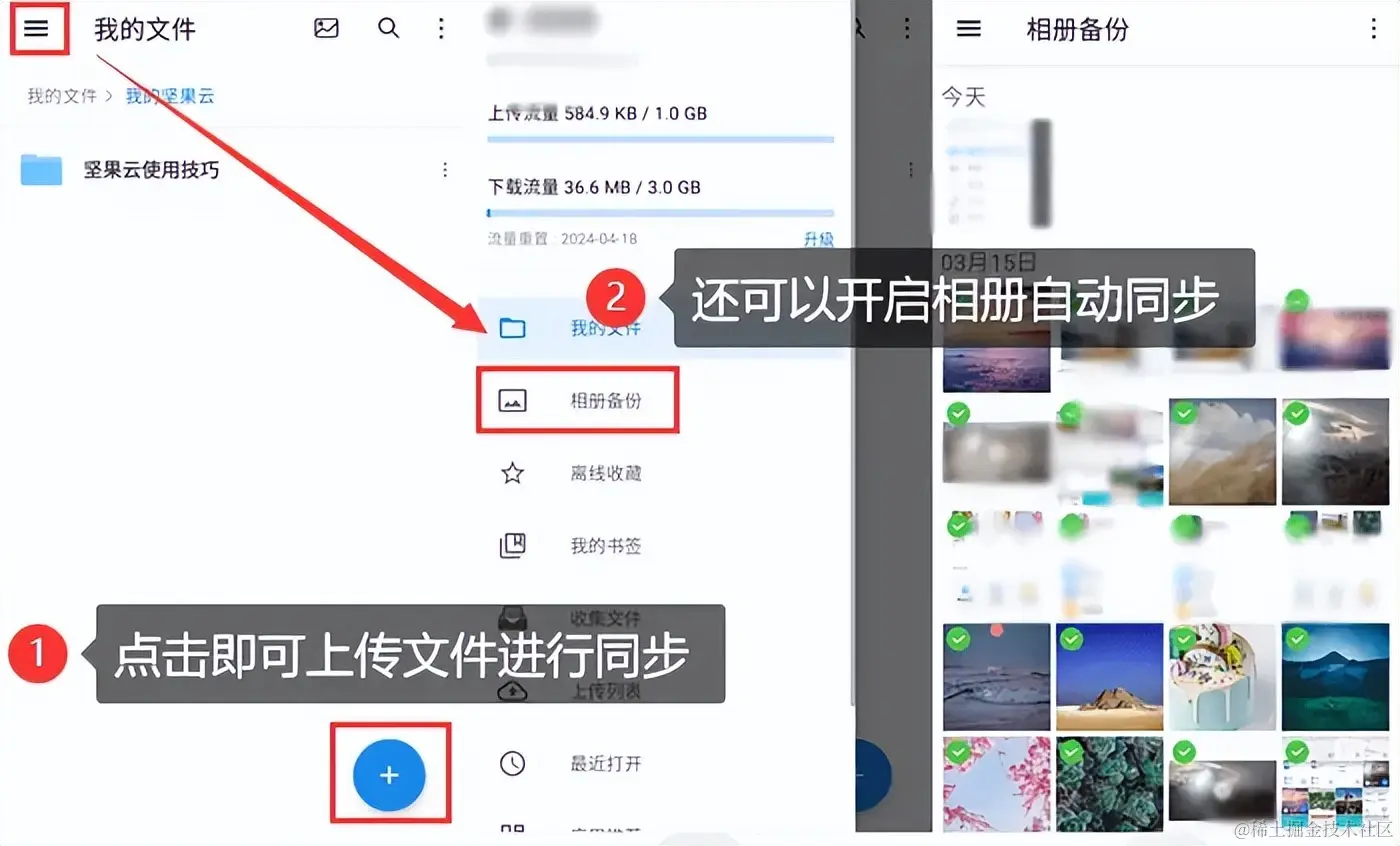 步骤2:然后,在手机或电脑上可以直接上传文件。同时,手机端还可以打开相册备份,选择自动同步照片,进行双重备份。