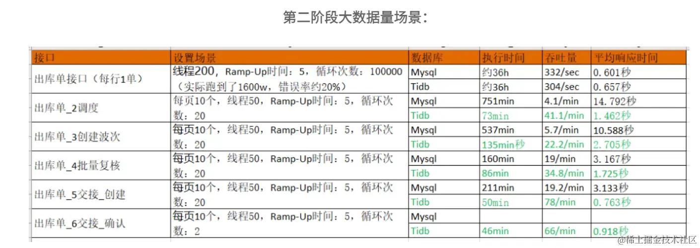 测试分两阶段进行,第一阶段测试数据为100万单,第二阶段测试数据为1300万单。在此基础上,使用Jmeter压力测试10万单结果如下: