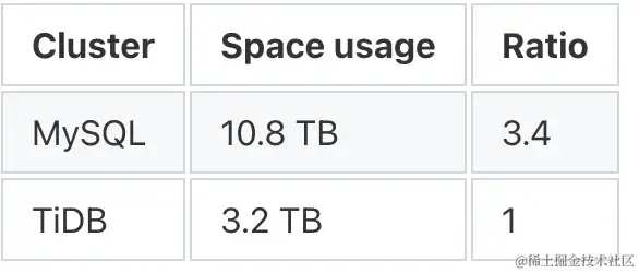 - MySQL 使用 48 TB 存储空间,而 TiDB 将使用 16 TB,仅为 MySQL 的 1/3。