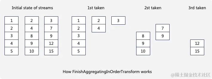 假设有3个stream当前算子会维护3个Chunk,每一次选取在当前的3个Chunk内找到最后一条数据的最小值,比如初始状态最小值是5,然后将3个Chunk内所有小于5的数据一次性取走,如此反复如果一个Chunk被取光,需要从改stream内拉取新的Chunk。