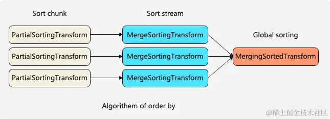 2)然后MergingSortedTransform将多个排好序的stream进行合并,并输出一个整体有序的stream,也是最终的排序结果。