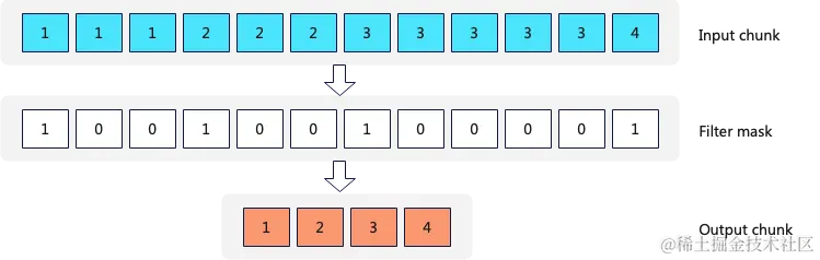 每个DistinctTransform的计算方式为:首先构建一个HashSet数据结构,然后根据HashSet,构建一个Filter Mask(如果当前key存在于HashSet中,则过滤掉),最后过滤掉不需要的数据。