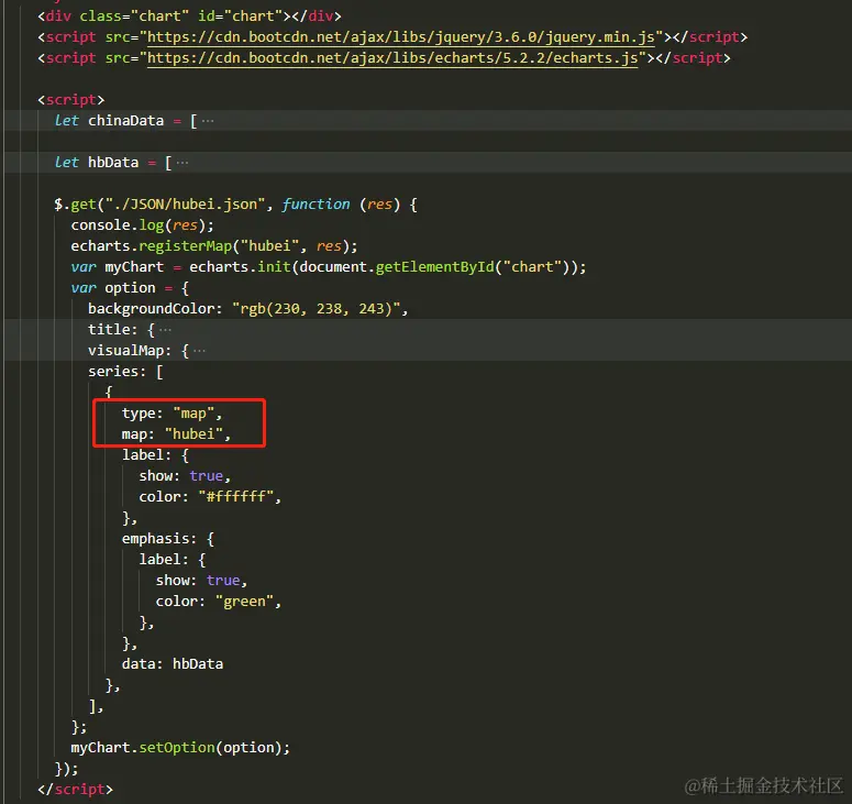 2、使用series的type: 'map', 需要设置map: 'china' , 这里的china就是echarts.registerMap所注册的名字