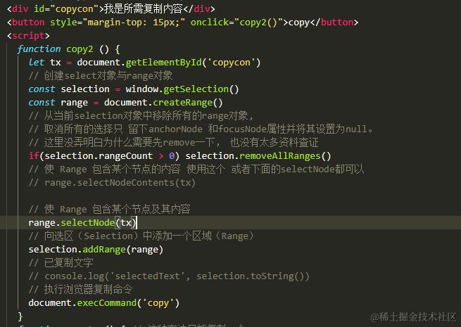 后来我又发现使用input / textarea进行复制操作 这种方式更加简单 因为二者有一个select() 函数能够便捷的复制而不需要去创建select对象与range对象