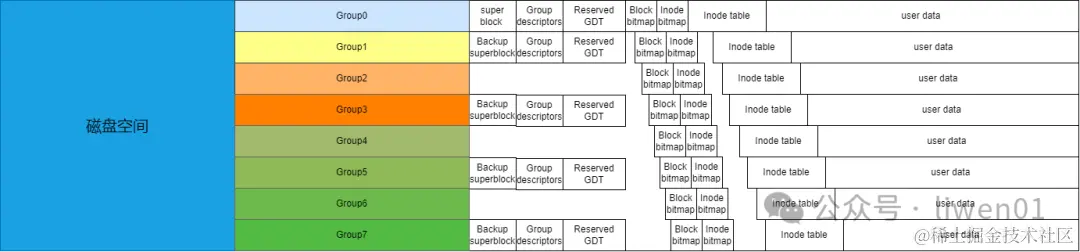 总体布局其中,每个Group中又有superblock、Group descriptors、bitmap、Inode table、usrer data、还有一些保留空间,细分之后的空间布局如下: