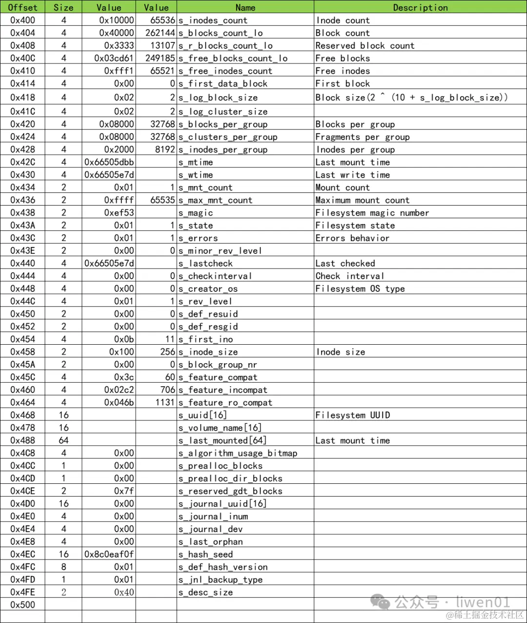 从上面《1.1 ext4文件系统信息表》中可以知道Primary superblock在第0号block,每个block的大小为4096Byte。