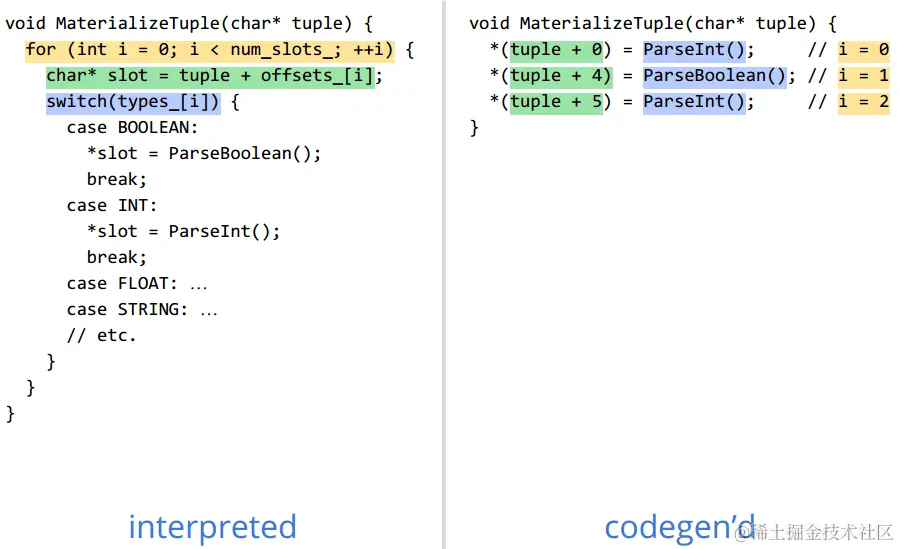 比如,下图左侧是通用代码,右侧是CodeGen之后的代码。CodeGen根据实际情况消除了不必要的循环和判断。