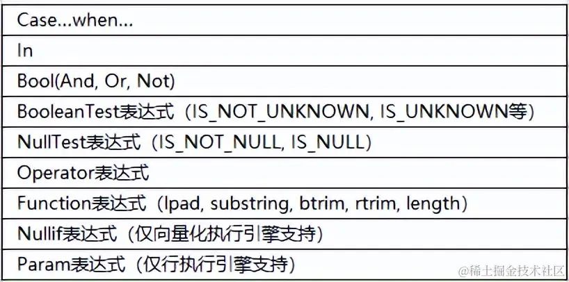 在向量化执行引擎中,仅当表达式出现在Scan节点的filter、Hash Join节点中的complicate hash condition,hash join filter,hash join target, Nested Loop节点中的filter,join filter, Merge Join节点的merge join filter, merge join target, Group节点中的filter表达式时,才会考虑是否使用LLVM动态编译优化。