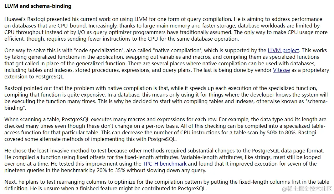 找对场景,一样有收益。比如根据ISPRAS 2017年发表的实验结果 jit-compiling sql queries in postgresql using llvm可知:pgbench测试下,OLTP场景中简单的查询加上JIT(Just-in-time及时编译,LLVM天然支持)扩展没有带来性能的提升,甚至将TPS(事务数/秒)从21.8降低到了7.8。