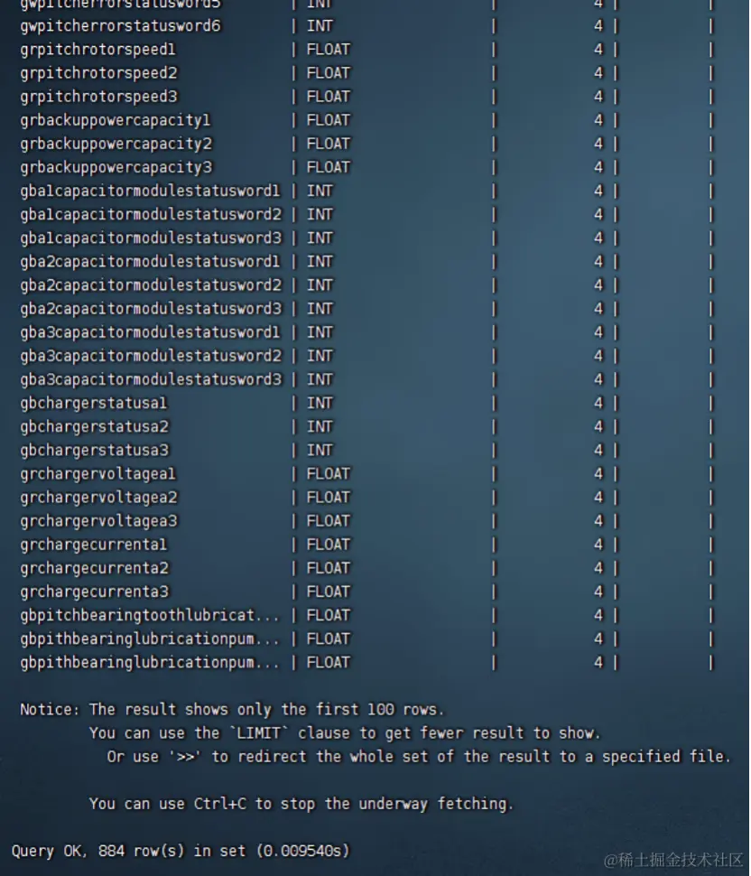 风电机作为一种利用风能来产生电力的大型设备。需要监控的指标十分之多。因此,在建模环节就有不小的难度。以下是一个 describe 超级表的输出,达到了 884 列。