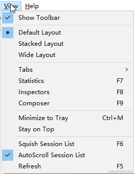 View(视图菜单) 这个菜单是针对fiddler显示界面与视图的一些设置,如果有些工具栏和按钮没有显示,就可以在这里来查找。如下图所示:
