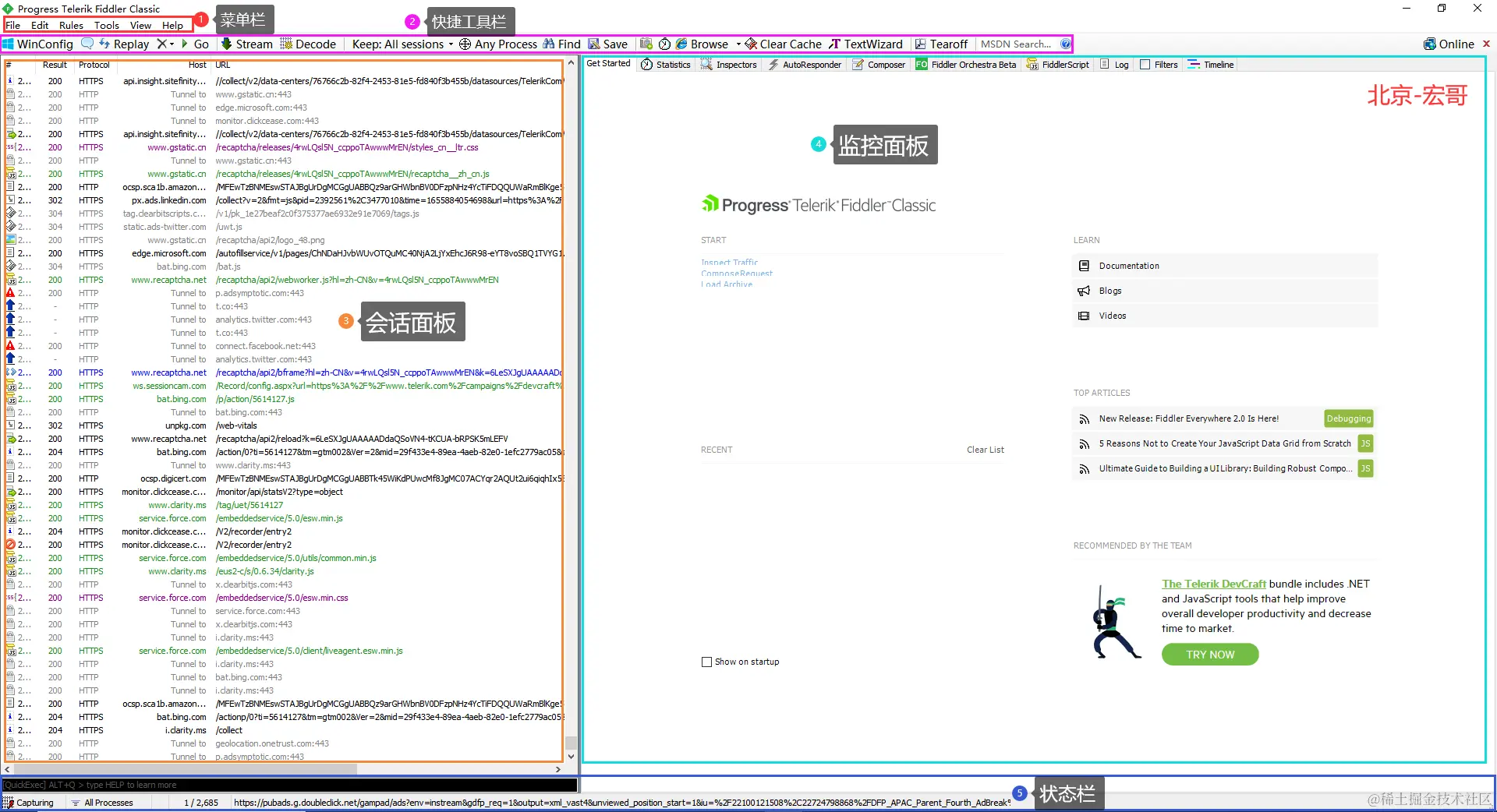 Fiddler的主界面分为:菜单栏(①)、工具面板(②)、会话面板(③)、监控面板(④)和状态面板(⑤)四部分组成,如下图所示: