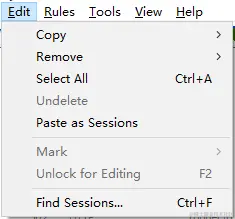 Copy:用来拷贝请求的相关信息。有用于复制在 web session 列表中选中的 session 信息,包括 just URL(选中的 session 的 URL 复制到剪切板中)、this column(拷贝菜单所在列的文本)、terse summary(选中 session 的简要说明复制到剪切板里)、header only (把 session 请求头复制到剪切板里)、session(把整个的 session 列表都复制到剪切板里)、full summary(把列表中显示的所有 session 信息复制到剪切板里)这些功能。