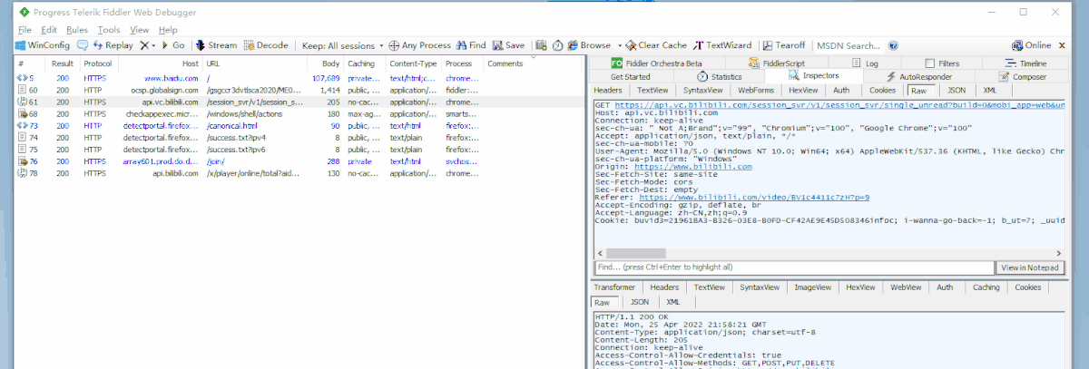 Inspectors:嗅探,用来查看会话的内容,上面是请求,下面是响应