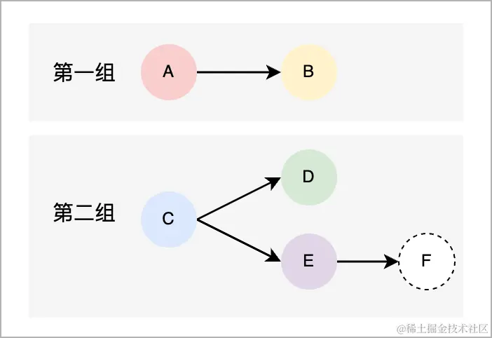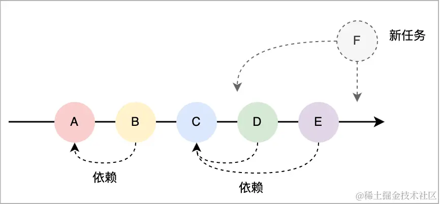 假如有A~E 5 启动启动任务,B依赖 A,C 不依赖 A和 B,D 和 E 分别依赖 C。新任务 F 会根据依赖关系追加在最后,或者插入到启动链路中的某个位置,如下图: