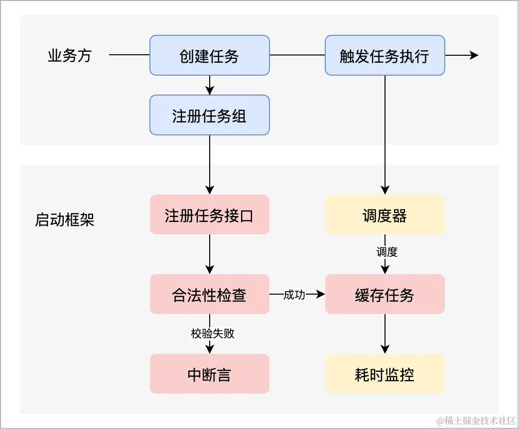- 业务方根据需求创建启动任务,通过任务组的方式注册到启动框架内,交由框架管理。