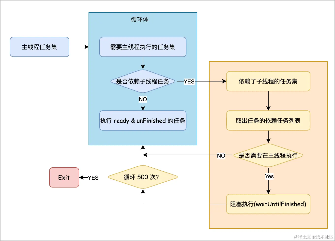 其中子线程的任务依赖扔由系统处理,框架会循环调用主线程的任务。调度逻辑如下图所示: