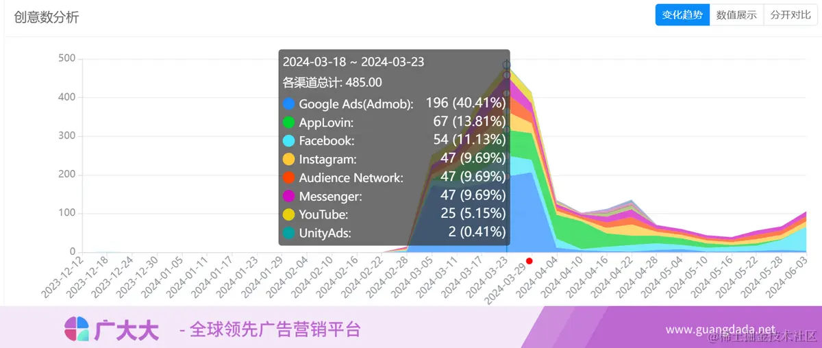 【Modern Community】最早于2023年10月开始投放,截至2024年6月4日,其在双端系统投放的素材去重后刚刚超过2400条,算是三消手游中投放量比较少的那一批。另外该产品的投放周期性也比较明显,大投期都集中在2024年3月,之后则逐步降低投放素材数量并保持小额投放,有种随缘刷脸的松弛感。