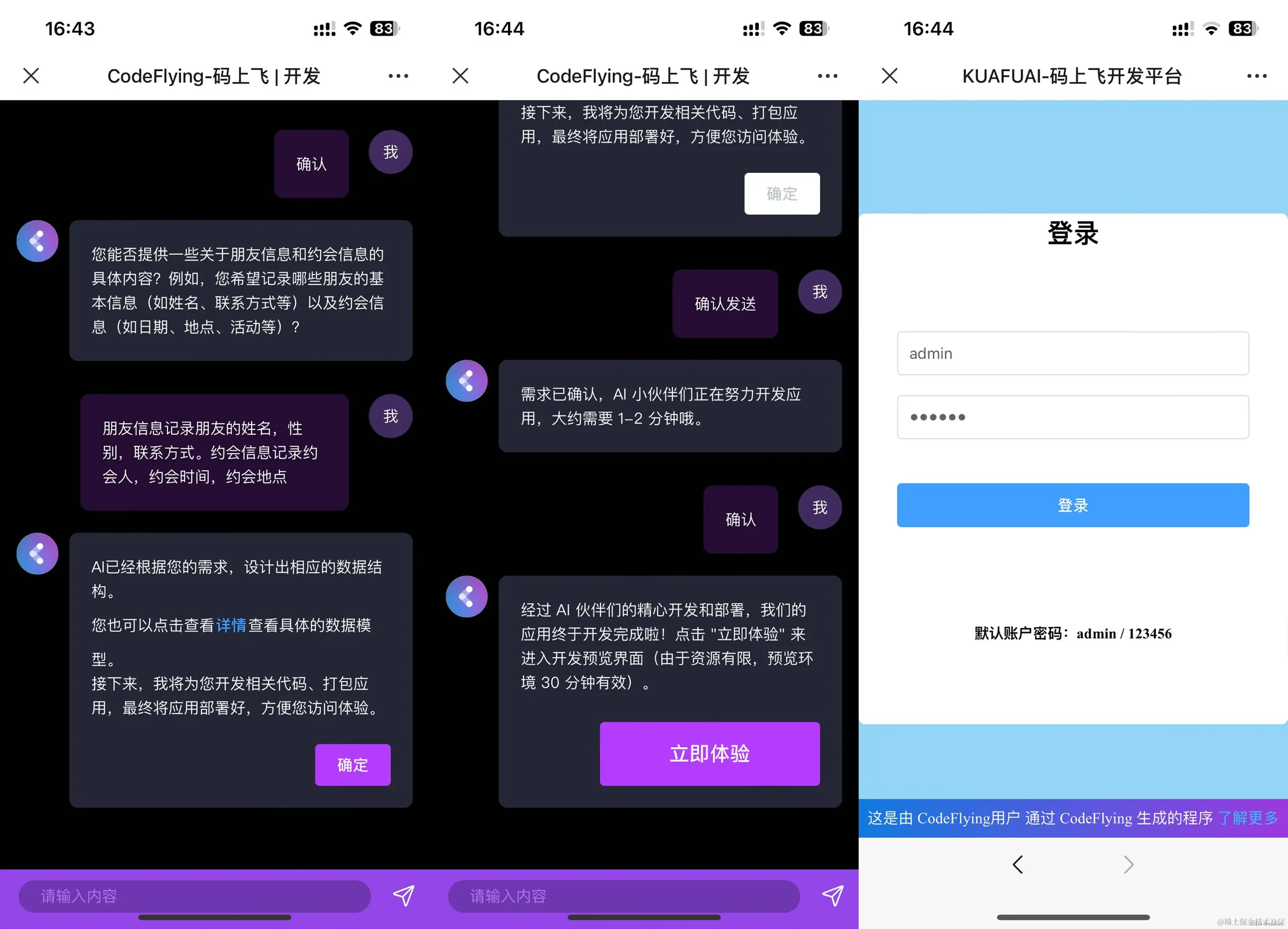 这里展示了我与CodeFlying的AI进行对话的记录,整个开发的流程不超过5分钟,直接就帮我开发好了一个软件。