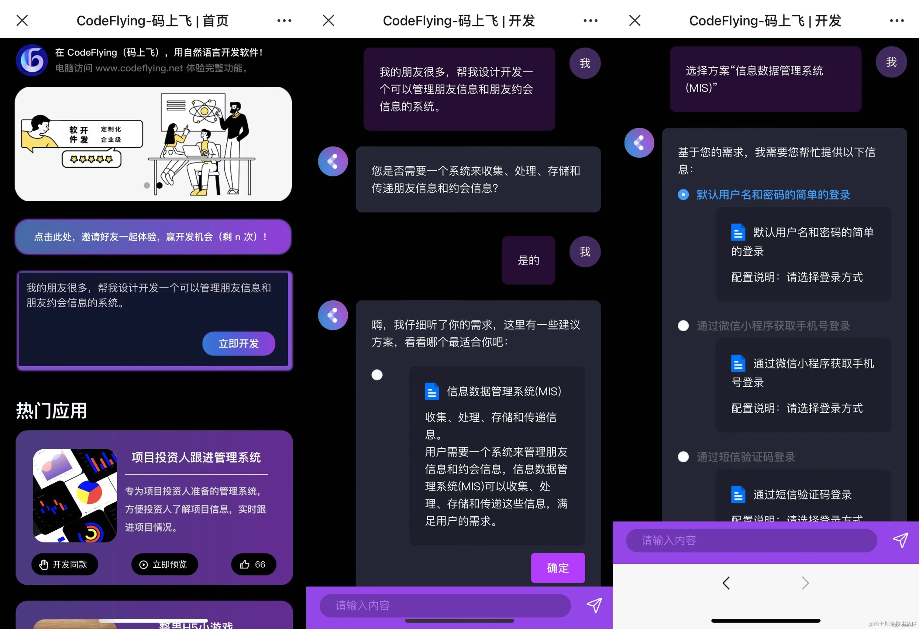 提出需求之后,CodeFlying就会自动匹配对应的解决方案,然后我们只需要选择软件登录的方式(ID密码登录、微信小程序登录、手机验证码),这里我选择了ID密码的方式登录。