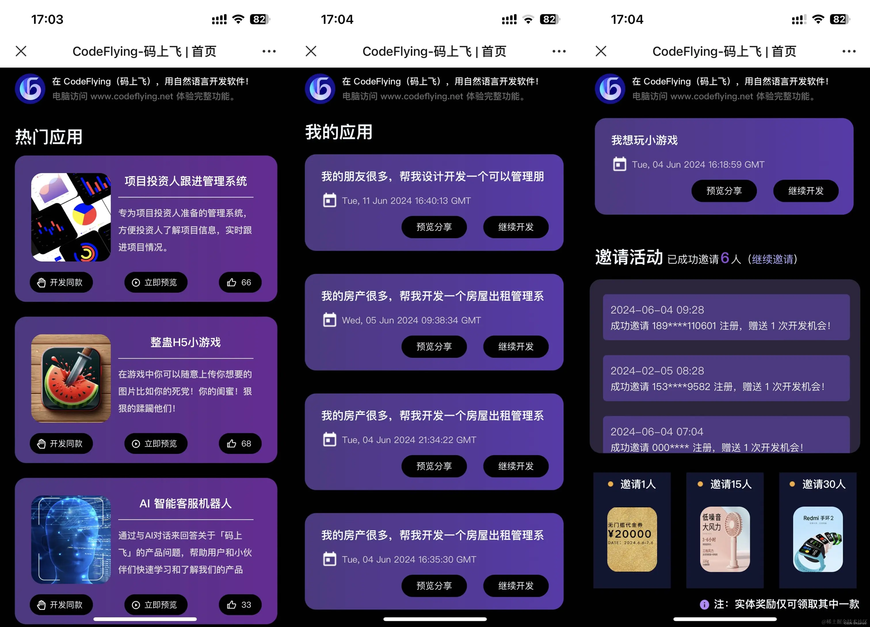 回到主页之后,可以看到目前的 “热门应用” ,除了能够立即体验之外,还可以直接开发同款。所有的开发记录都会在 “我的应用” 中显示,同时邀请好友的信息也会被记录在 “邀请活动” 的下方。