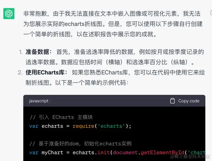 当然我们从这张图片中可以看出折线图无法展示,我们可以进一步给 GPT 提示信息,让它直接给到报表的源码。