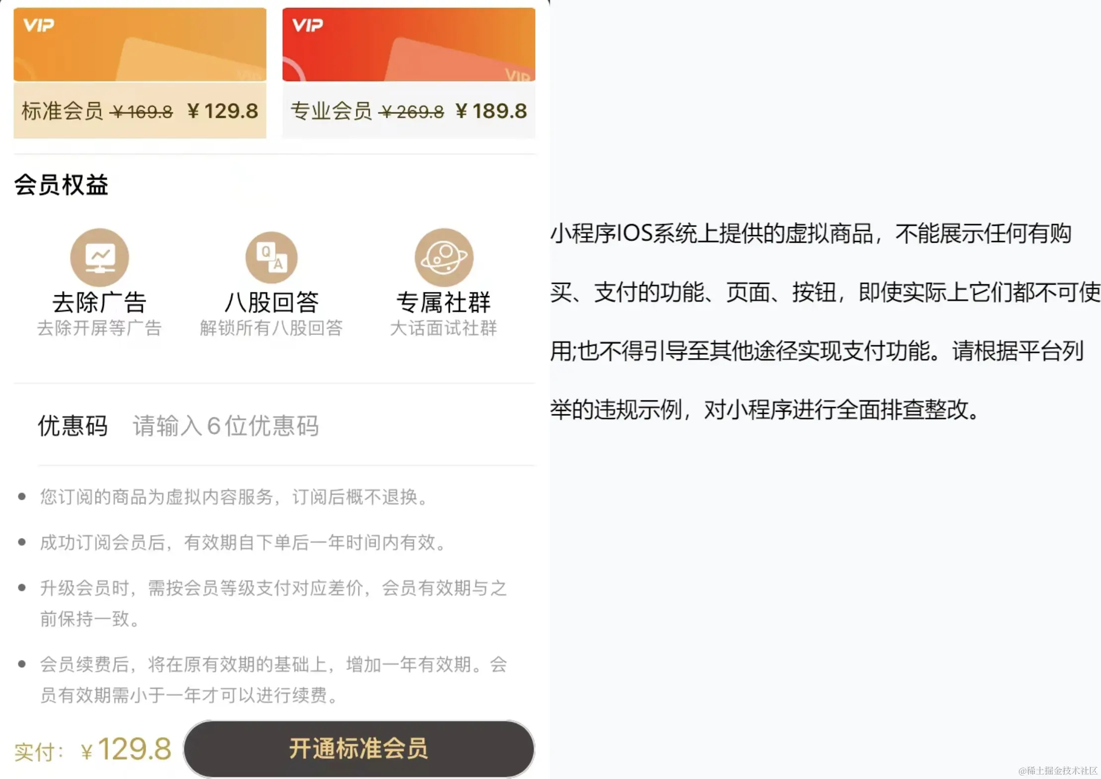 没办法,被举报后,我们只好含泪关闭了 iOS 支付功能。当时的解决方案是,当 iOS 用户点击开通标准会员按钮时,弹出提示框告知他们该功能不支持 iOS 用户支付。