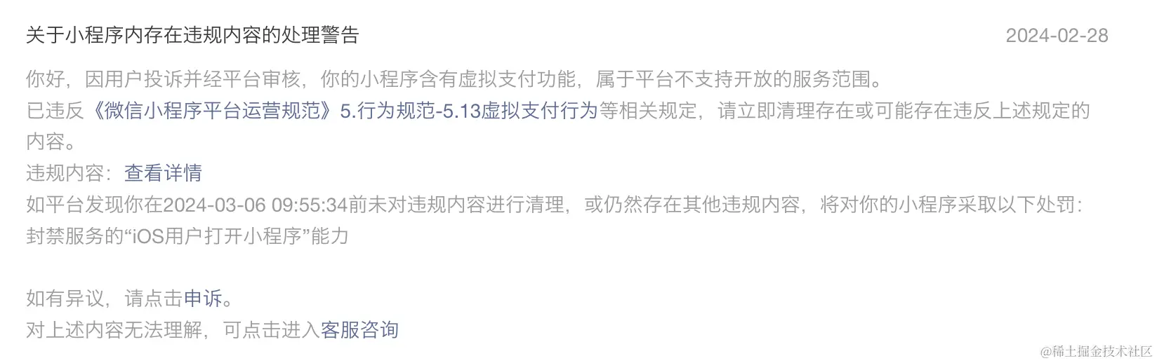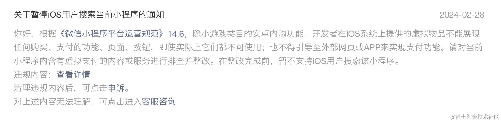 说来也巧,那几天正忙于其他事情,没顾上这个,结果小程序的 iOS 搜索功能被封禁,真是哭笑不得。
