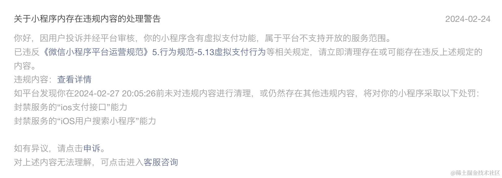 iOS 系统和微信因为抽成问题闹得不愉快。简单来说,iOS 涉及充值的部分(是否全部未知)会抽取 30% 的手续费,而微信不愿意支付这部分费用。因此,iOS 平台不再允许微信小程序虚拟支付相关的功能。