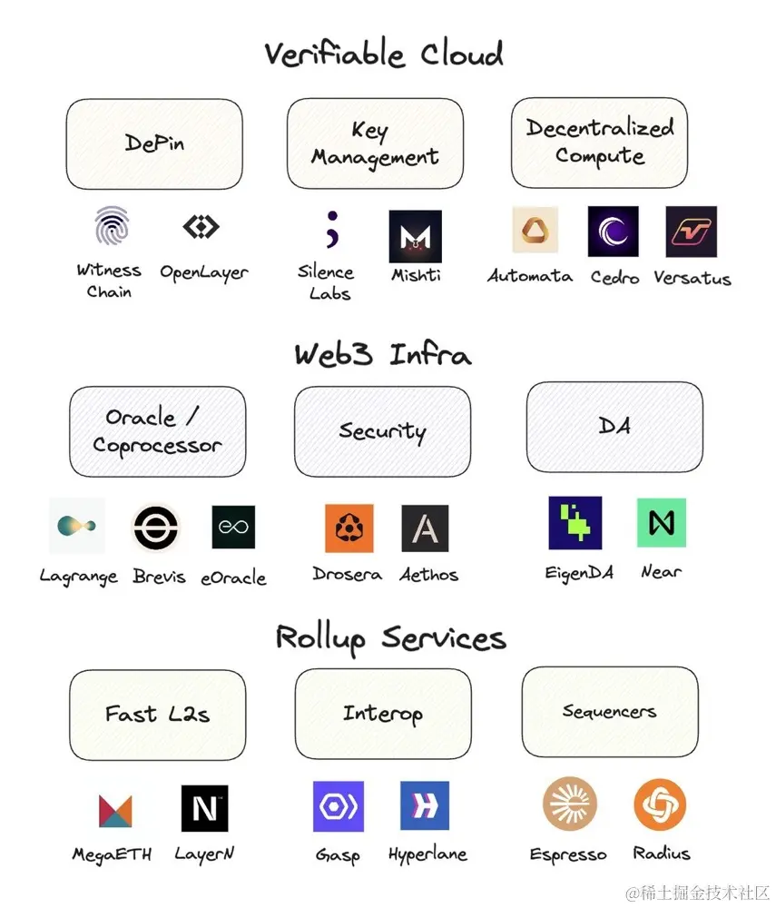其次是 Web3 基础设施。 AVS 可为区块链和 Rollup 所依赖的基本原理提供动力.通过确保 DA 层的安全、提供 ZK 支持的预言机以及部署可轻松集成的监控系统,AVS 可加强 Web3 生态。