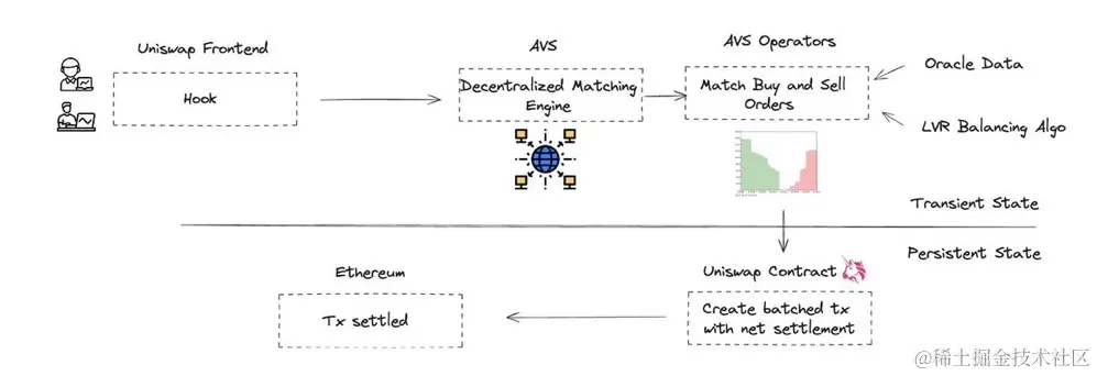 比如 Uniswap v4 的 Hook 机制,它可以与托管在专用 AVS 节点上的去中心化匹配引擎相结合。这个运营者池可以高效地将成千上万的交易请求与交易对手进行匹配,创建在链上结算的批量交易。