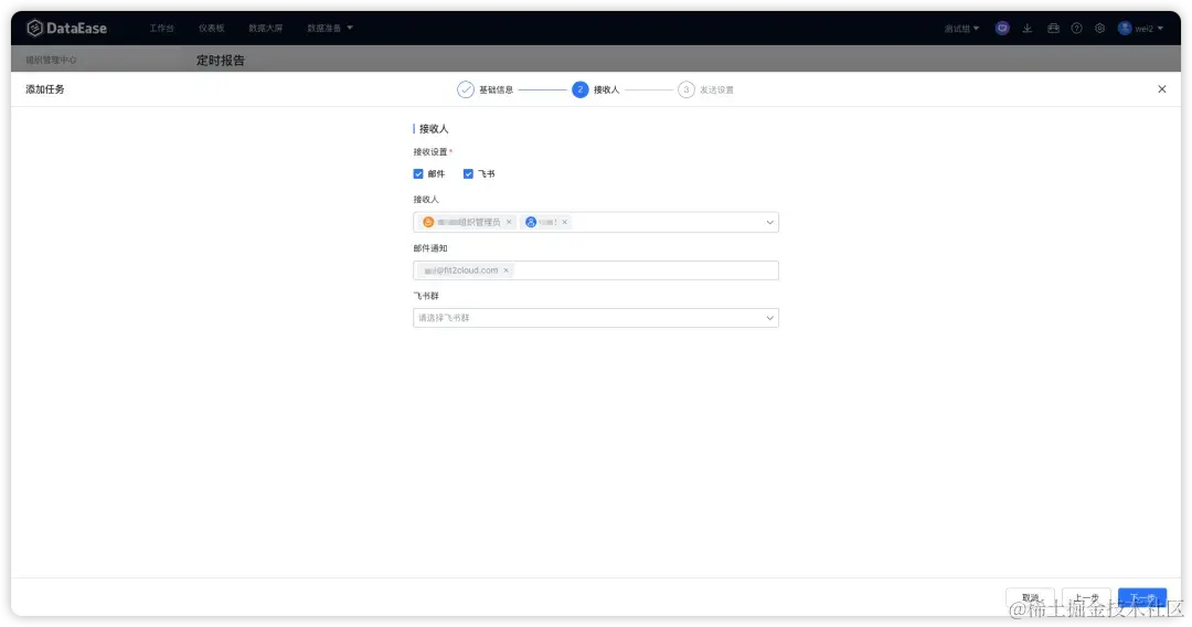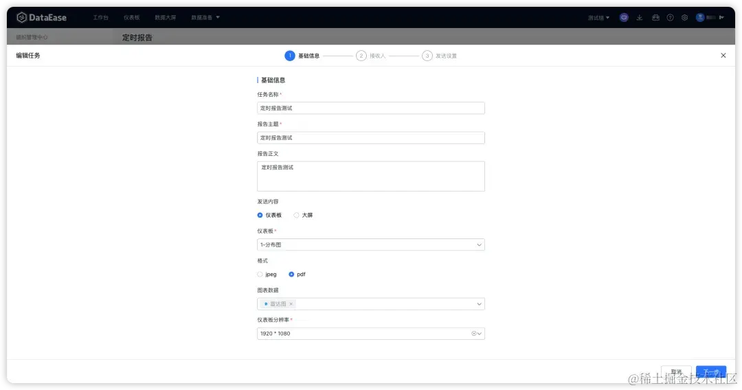 DataEase v2.7.0版本中新增了定时报告模块,用户可以设置定时任务,通过邮件、飞书等渠道,将特定的仪表板、大屏,以及其他需要重点关注的图表数据定时发送给指定的DataEase用户,也可以通过邮件的形式将报告内容发送给外部邮箱。
