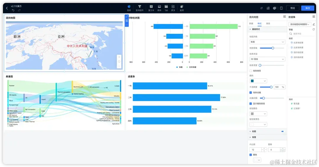 ■ 图表:支持对称条形图、桑基图、流向地图、进度条