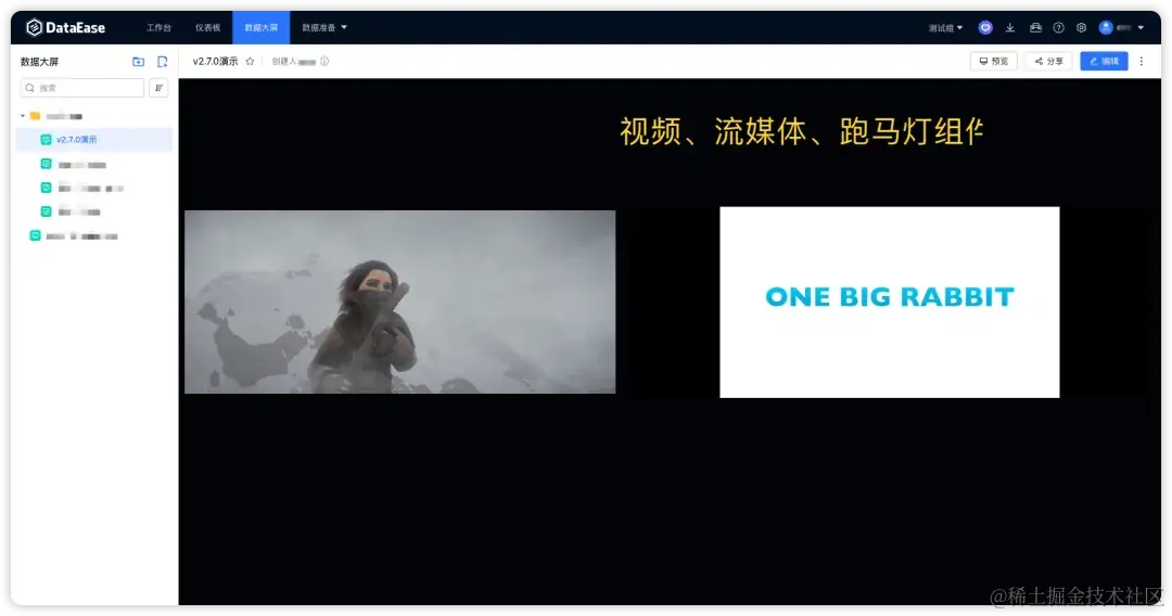 在DataEase v2.7.0版本中,仪表板和数据大屏中新增视频、流媒体、跑马灯组件,为仪表板和数据大屏的制作提供了更多的组件选择。此外,在数据大屏中还引入了查询组件的支持,以满足部分用户对于大屏的交互需求。