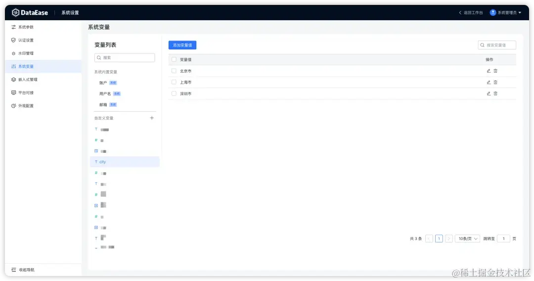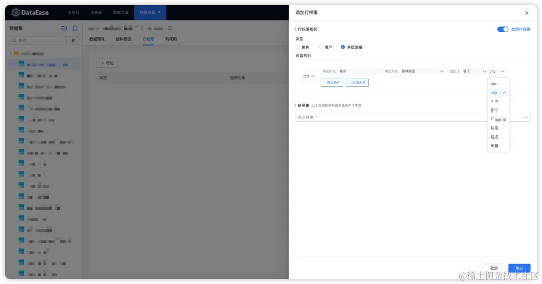 在配置数据集的行权限时,管理员可以使用系统内置变量,也可以使用这些自定义的系统变量,进一步拓展了行权限的使用场景。
