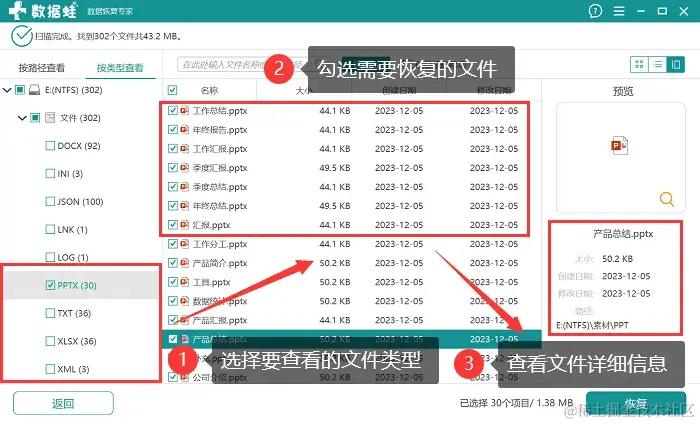 步骤3:扫描完成后,根据实际恢复需求,选择要查看的文件类型并定位到文件,查看文件的详细信息;