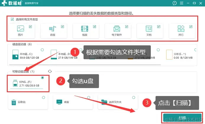 步骤2:在主界面,勾选上需要恢复的文件类型并勾选u盘,点击【扫描】 ;