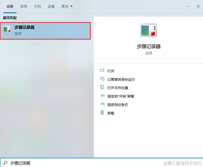 步骤1:在电脑搜索框中输入 “步骤记录器” ,然后点击“应用”或按下回车键,打开“步骤记录器”窗口。