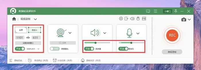 步骤2:在视频录制模式中,你可以调整录制的音频的来源,如麦克风、扬声器等,如果你有录制摄像头的需求,也可以在页面开启。