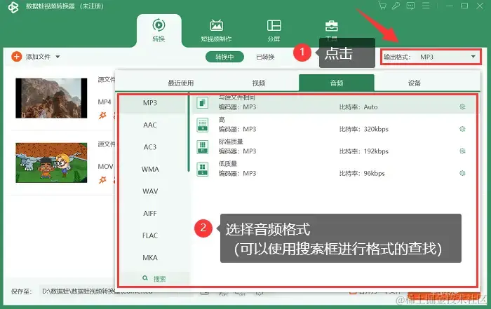 步骤2:视频怎么转音频mp3?在**【输出格式】**选项中,选择所需的音频格式,如MP3、WAV等。