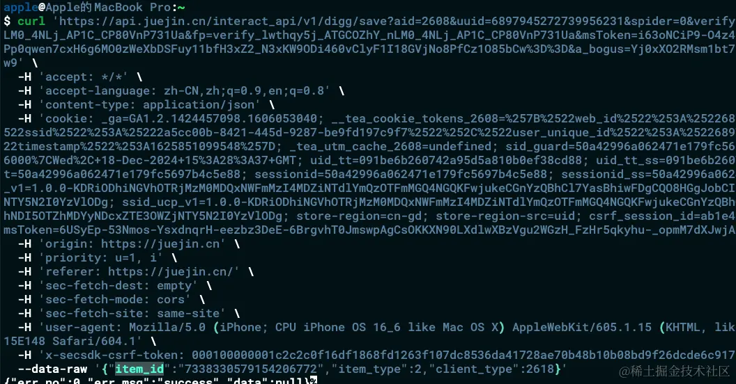 具体如下。我们可以看到,服务端返回的是重复点赞,也就是掘金并没有做我们所谓世俗意义上的放重放攻击。掘金通过查询数据库(推测item_id是唯一索引值),来判断是否已经点赞然后返回前端逻辑。