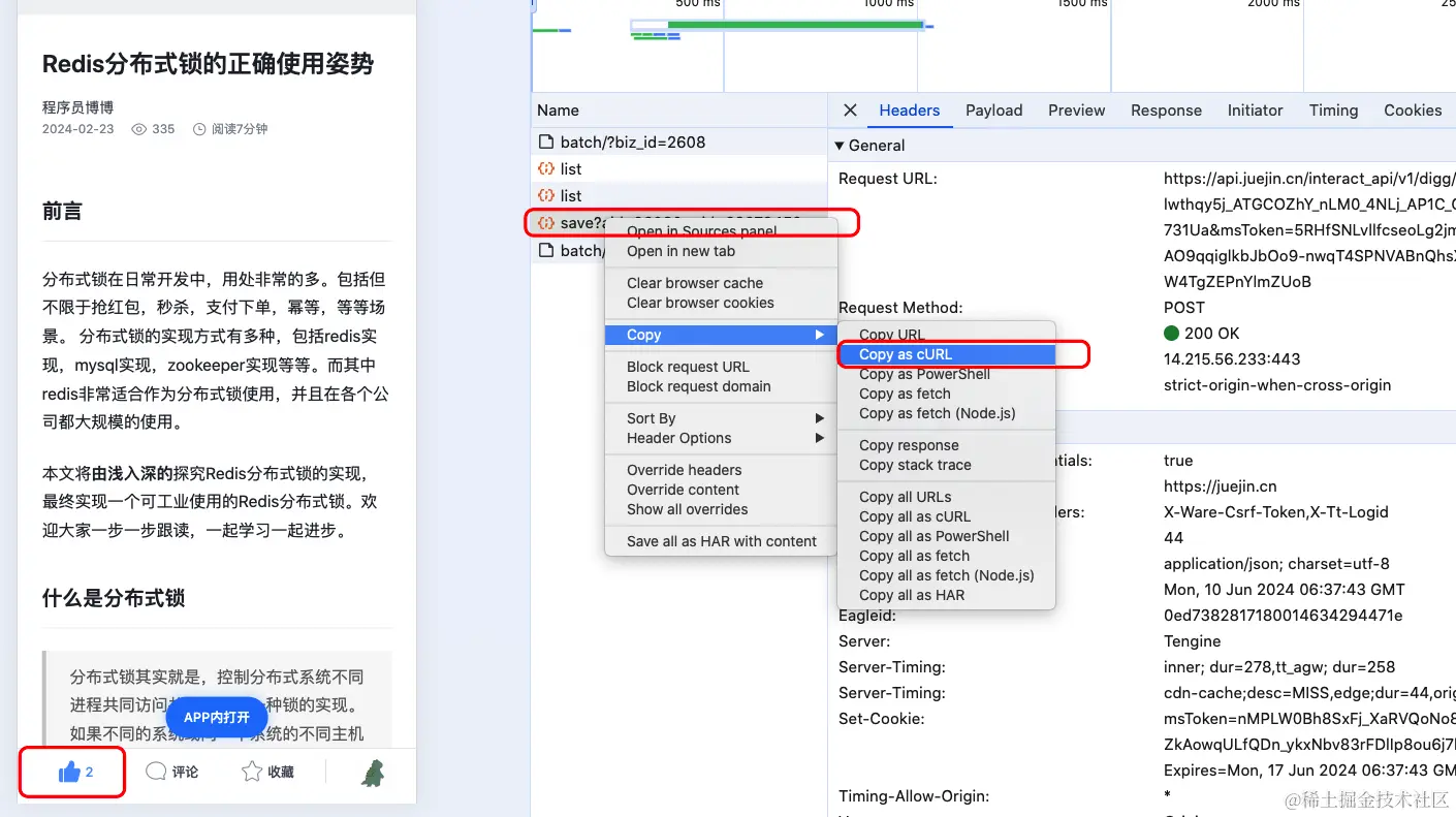 我们以掘金文章点赞为例。当我点赞之后,H5会发送一个请求给到掘金后端服务器,我可以通过f12看到完整的请求参数,包括url,param等等,然后我可以通过copy把这个请求给copy出来,那么我就可以做到一个放重放攻击了。