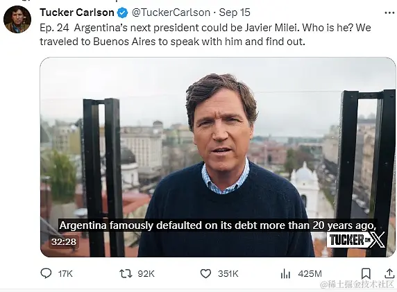 美国著名记者塔克·卡尔森(Tucker Carlson)对曾对米莱进行采访,该采访在推特上浏览量超过 4.21 亿次。这份采访的的关键内容之一是阿根廷经济的美元化。 在该该提案中,米莱一直强调取消阿根廷中央银行的重要性,并谈到比特币可以为这一过程提供机会。