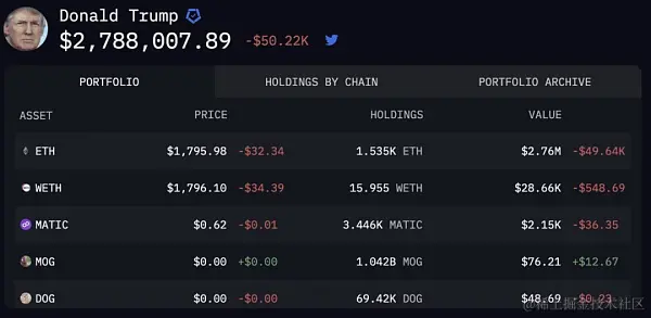 他在2022年12月16日推出的 NFT 项目——特朗普数字藏品卡,全部卖光后获得了总计 487 万美元的收益。而在疑似他本人的加密钱包中,据华盛顿非营利组织公民责任与道德组织 (CREW)2013年8月14日披露,还持有高达近 280 万美元的加密资产(ETH)。