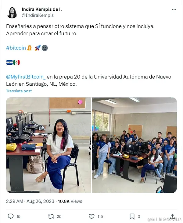 她还积极参加了一些加密相关活动,例如在2023年8月份她出生的新莱昂省,她参与推进了“我的第一个比特币”课程的相关认证。