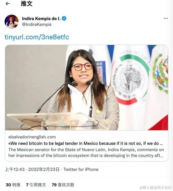 肯皮斯在比特币和加密资产倡导者中广为人知,因为她一直直言不讳地表示,比特币的早期采用可能对墨西哥带来机遇。自 2018 年上任以来,这位参议员在过去几年一直鼓励加密经济。据《比特币杂志》报道,她还曾推动墨西哥制定类似萨尔瓦多的比特币法规。
