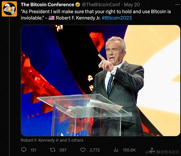 2023年7月24日,小肯尼迪参加了在迈阿密举行的比特币会议,并宣布他的竞选活动将是“历史上第一个通过闪电网络接受比特币捐赠的总统竞选活动” 。