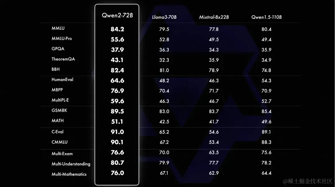 - 增大了上下文长度支持,最高达到128K tokens(Qwen2-72B-Instruct)。