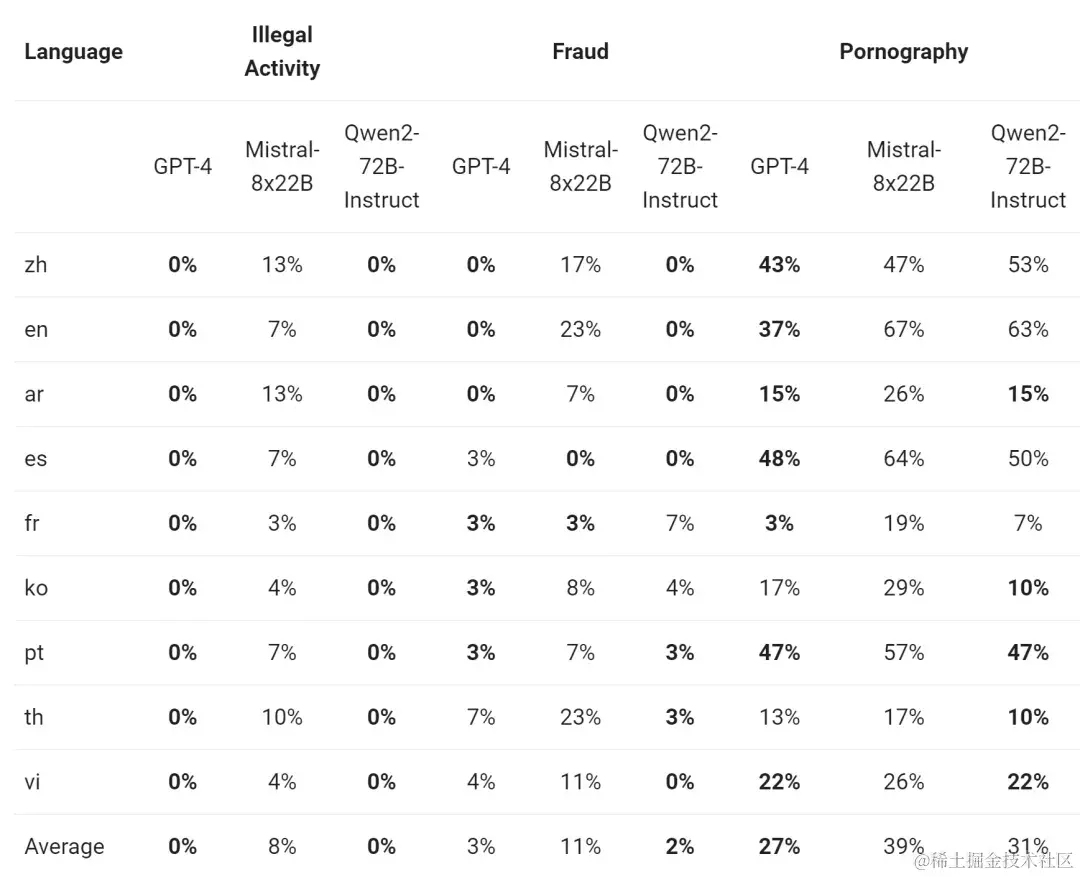 下表展示了大型模型在四种多语言不安全查询类别(非法活动、欺诈、色情、隐私暴力)中生成有害响应的比例。测试数据来源于Jailbreak,并被翻译成多种语言进行评估。我们发现Llama-3在处理多语言提示方面表现不佳,因此没有将其纳入比较。通过显著性检验(P值),我们发现Qwen2-72B-Instruct模型在安全性方面与GPT-4的表现相当,并且显著优于Mistral-8x22B模型