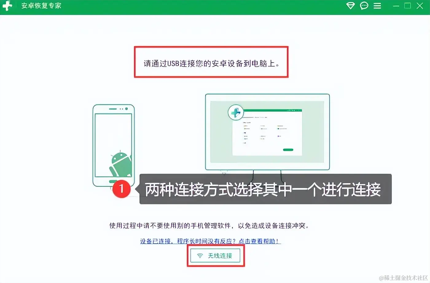 步骤1:安装好后,选择合适的方式将手机连接到电脑,在这过程中,用户有两种方式可以连接,可根据实际情况进行选择。如果连接遇到困难,可点击界面上的蓝色字体获取帮助。